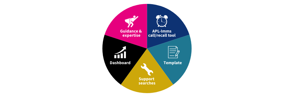 APL-Imms enables GP teams to identify all pre-school children registered with their practice whose vaccinations are due or overdue, review each child’s vaccination record at a glance, and access information to support conversations with parents.