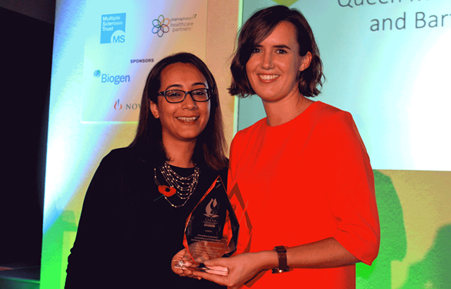 Alison Thomson, the Barts MS designer who developed the communication tool and consulted with the Barts MS Advisory Group, collected the award on behalf of Professor Giovannoni and the team.