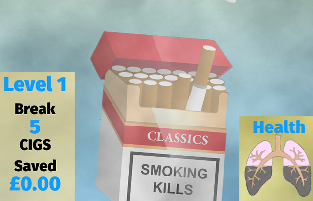 In the game, players have to swipe a certain number of cigarettes to break them within a time limit. As well as progressing through levels, the app includes a quit journal where users can calculate how much money they are saving.
